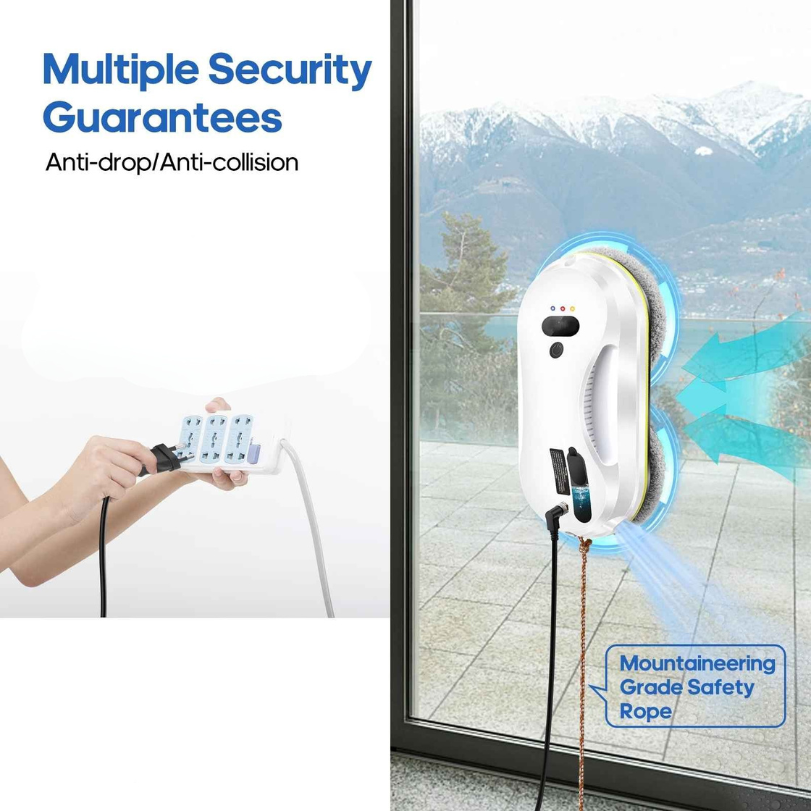 CleaningBot anpassar sig till olika ytor, från fönster och kakel till speglar och bordsskivor, för ett jämnt resultat. Dess sladd har lång räckvidd, vilket gör det enkelt att rengöra även höga eller svåråtkomliga ställen. Den automatiska returfunktionen för roboten tillbaka till startpunkten när den är klar.