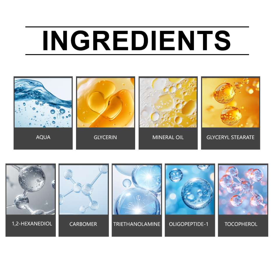 | Ingredienser | Glycerin, Mineralolja, Glycerylstearat, 1-2 Hexandiol, Karbomer, Trietanolamin, Oligopeptid-1 Och Tokoferol |