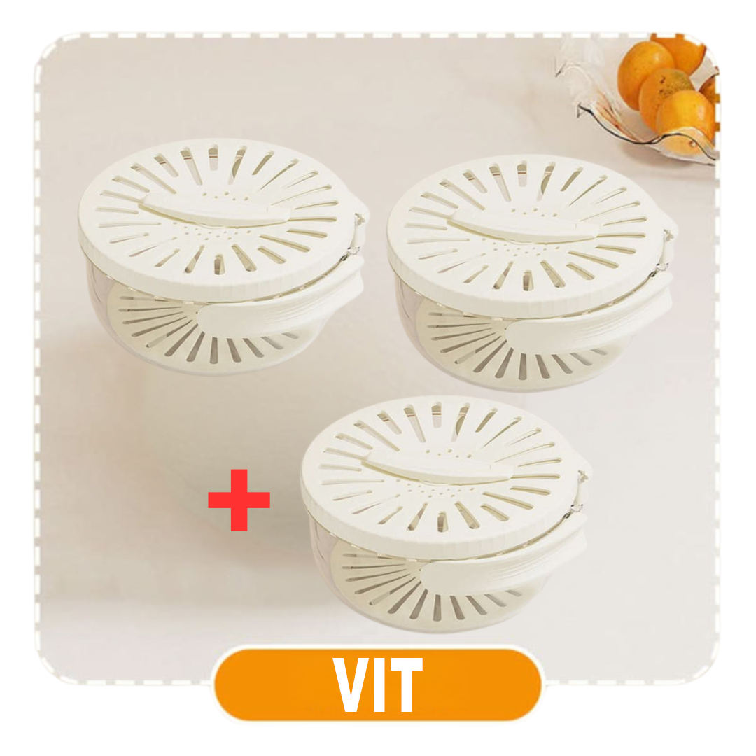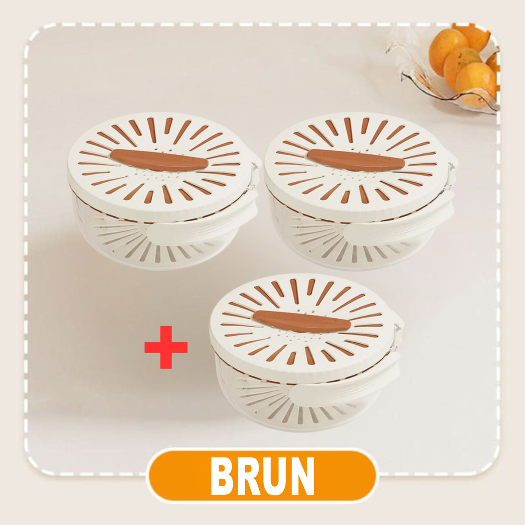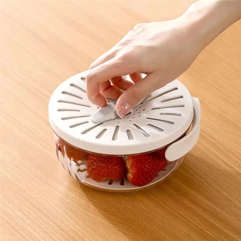 Snäpplocket förseglas säkert med en enkel vridning, vilket möjliggör snabb och enkel tömning med bara en hand. Den sitter stadigt på plats för att förhindra spill. Denna korg är tillverkad av lågtemperaturbeständigt material och kan säkert förvaras i kylskåp för att hålla frukten färsk.