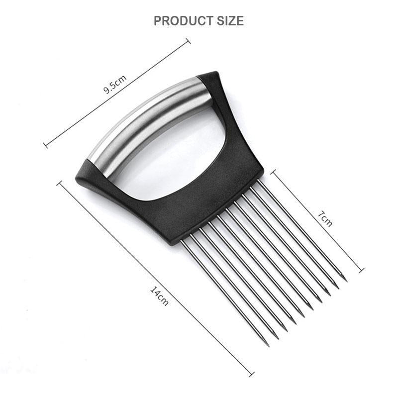 Inte bara avsedd för lökar. Kan även användas för andra hårda ingredienser som frukt, potatis, morötter, citroner och till och med vitlök. Grönsakshållaren kan också användas som en köttmjukare. Den långa stålnålen tränger djupt in i köttet för att förbättra smaken. Den är också lätt att rengöra efter användning. Lätt i vikt, alla kan använda den vid matlagning.