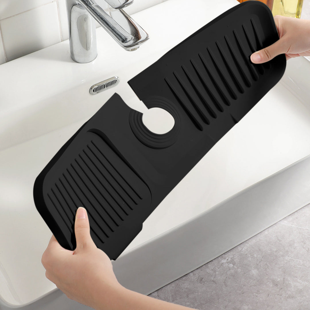 De Globetrek° SplashGuard-mattan har ett justerbart centrumhål som rymmer kranar med en diameter på upp till 6,6 cm. För att anpassa passformen till din specifika kran, trimma bara längs de förmarkerade hålguiderna på mattan till önskad storlek. Se till att mäta din kran och diskbänkens mått innan du köper!