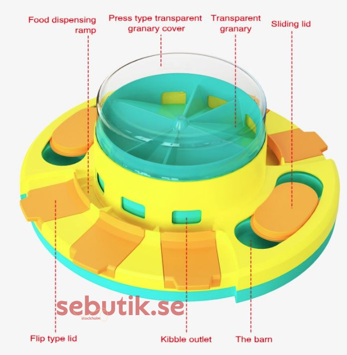 Håll hans tass för att trampa på det genomskinliga locket, de fallande godbitarna drar snabbt till sig hundens uppmärksamhet. Täck nu över ladugårdslocken och träna hunden att leta efter godbitarna. Efter många repetitioner kommer din hund att förstå det korrekta sättet att använda denna produkt.