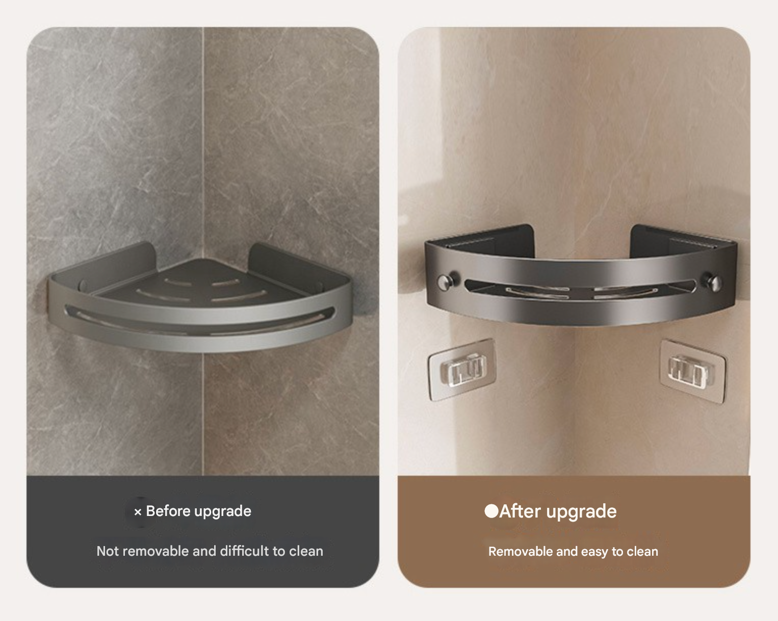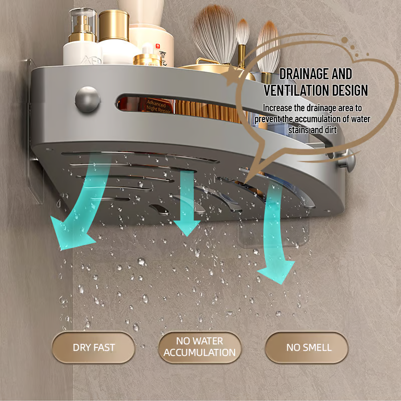 Den triangulära, solfjäderformade designen passar perfekt i hörn och maximerar förvaringen utan att ta upp onödigt utrymme. Med ett utökat förvaringsutrymme rymmer den bekvämt schampo, balsam, body wash och andra viktiga saker, vilket håller ditt utrymme snyggt och organiserat samtidigt som det är lätt att komma åt.